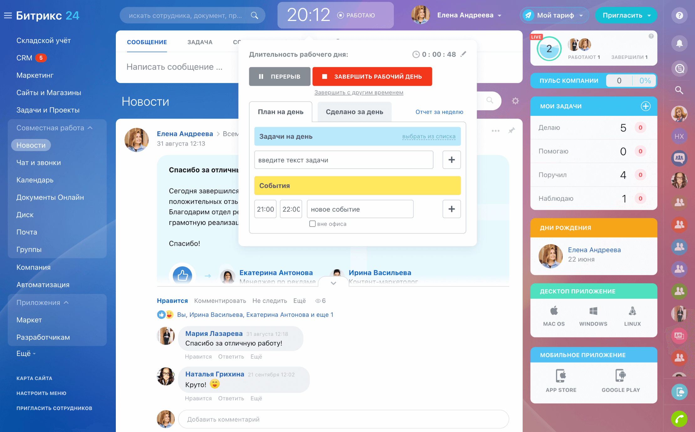 Битрикс24 — это надежный инструмент для бизнеса, обеспечивающий эффективное управление компанией, планирование задач, их делегирование и контроль за выполнением